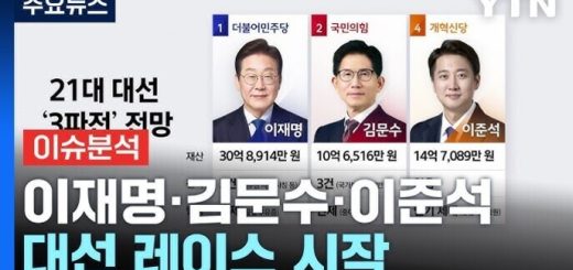 세 명의 남성이 각각 파란색, 빨간색, 주황색 옷을 입고 마이크를 들거나 손을 들어 인사하는 모습. 상단에는 'FACT 추적'과 YTN 로고가 있고, 하단에는 '선택 2025, 약속의 무게', '대선 공약 집중 점검 ① -정치·사법·사회 분야-'라는 문구가 있다.
